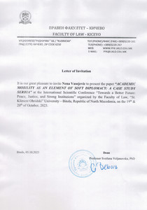 Vasojević, Nena A. (2024) ACADEMIC MOBILITY AS AN ELEMENT OF SOFT DIPLOMACY: A CASE STUDY SERBIA. In: Назив зборника International Scientific Conference “Towards a Better Future: Peace, Justice, and Strong Institutions”. Kicevo : University "St. Kliment Ohridski"- Bitola, Faculty of Law, 2024, Bitola, pp. 201-210. ISBN 978-608-4670-24-7